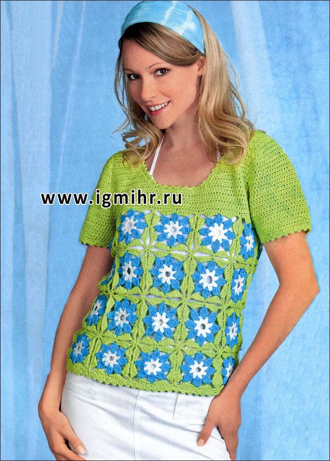 Летний пуловер из цветочных квадратов. Крючок..
