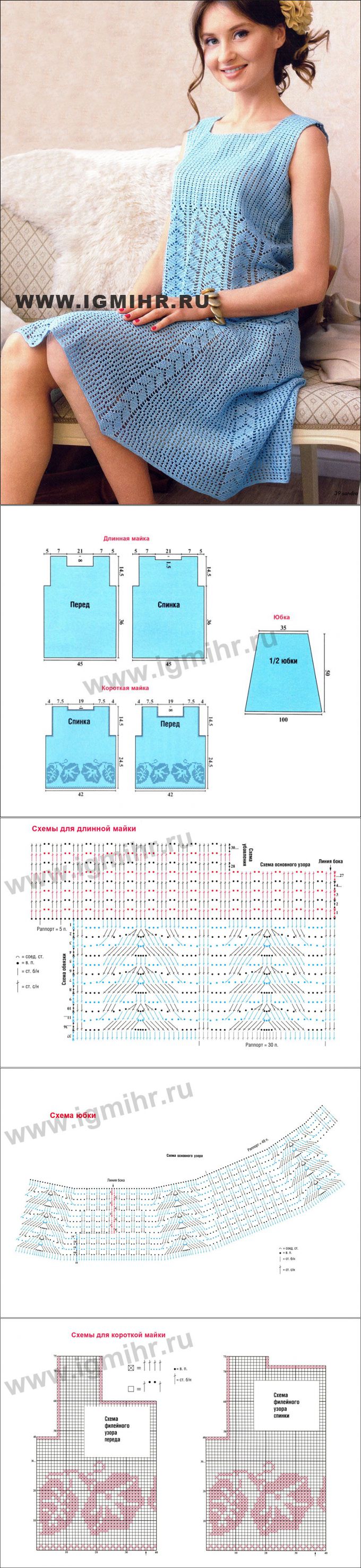 Летний комплект голубого цвета, в технике филейного вязания: 2 майки и юбка. Крючок