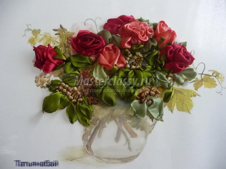 Вышивка лентами. Букет роз в вазе. Часть 2. Мастер-класс с пошаговыми фото