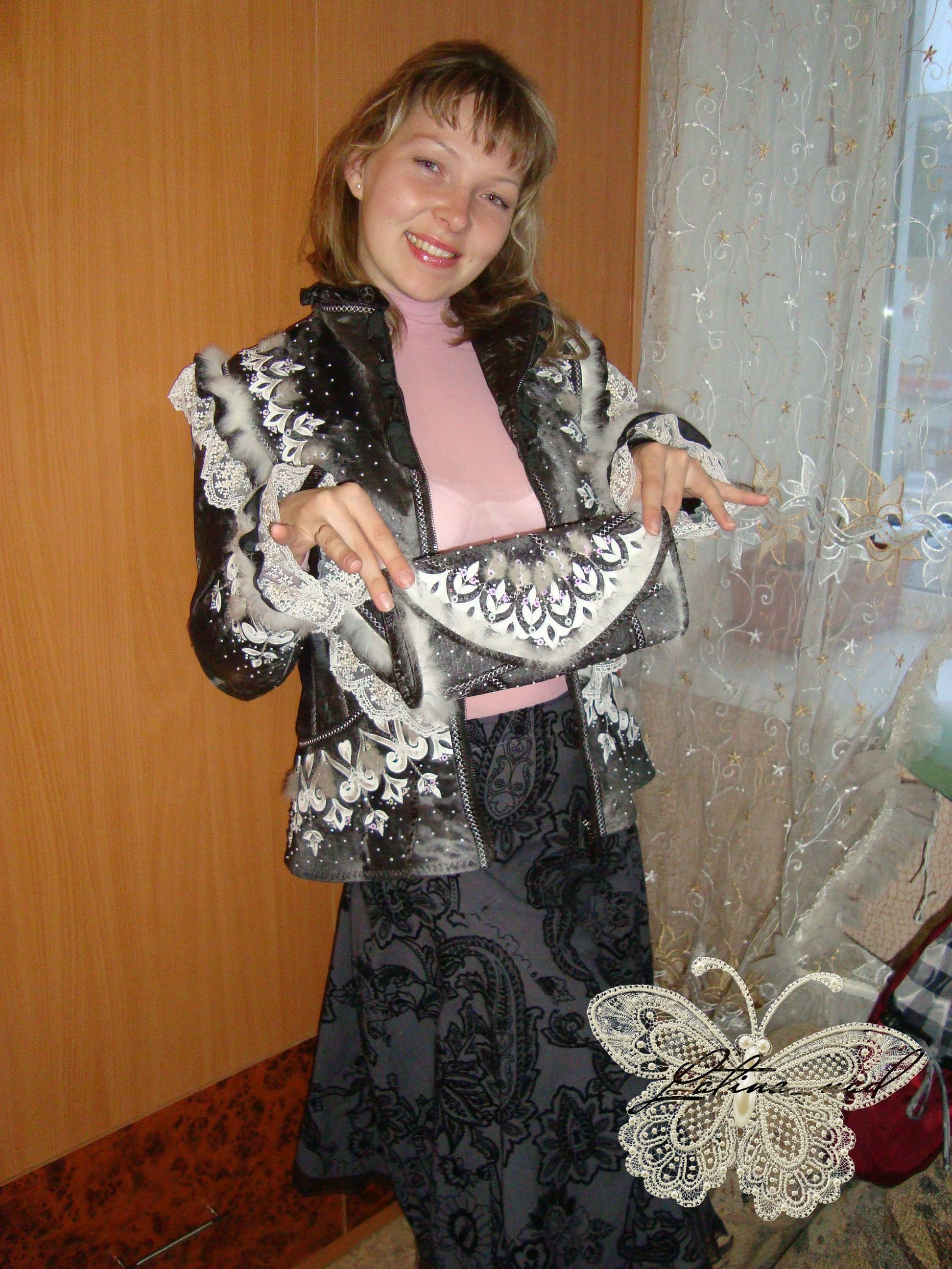 Авторская работа,Курточка и клатч из натурального меха, декор: аппликации из натур.кожи, шелковые кружева, бисер, декоративные строчки.