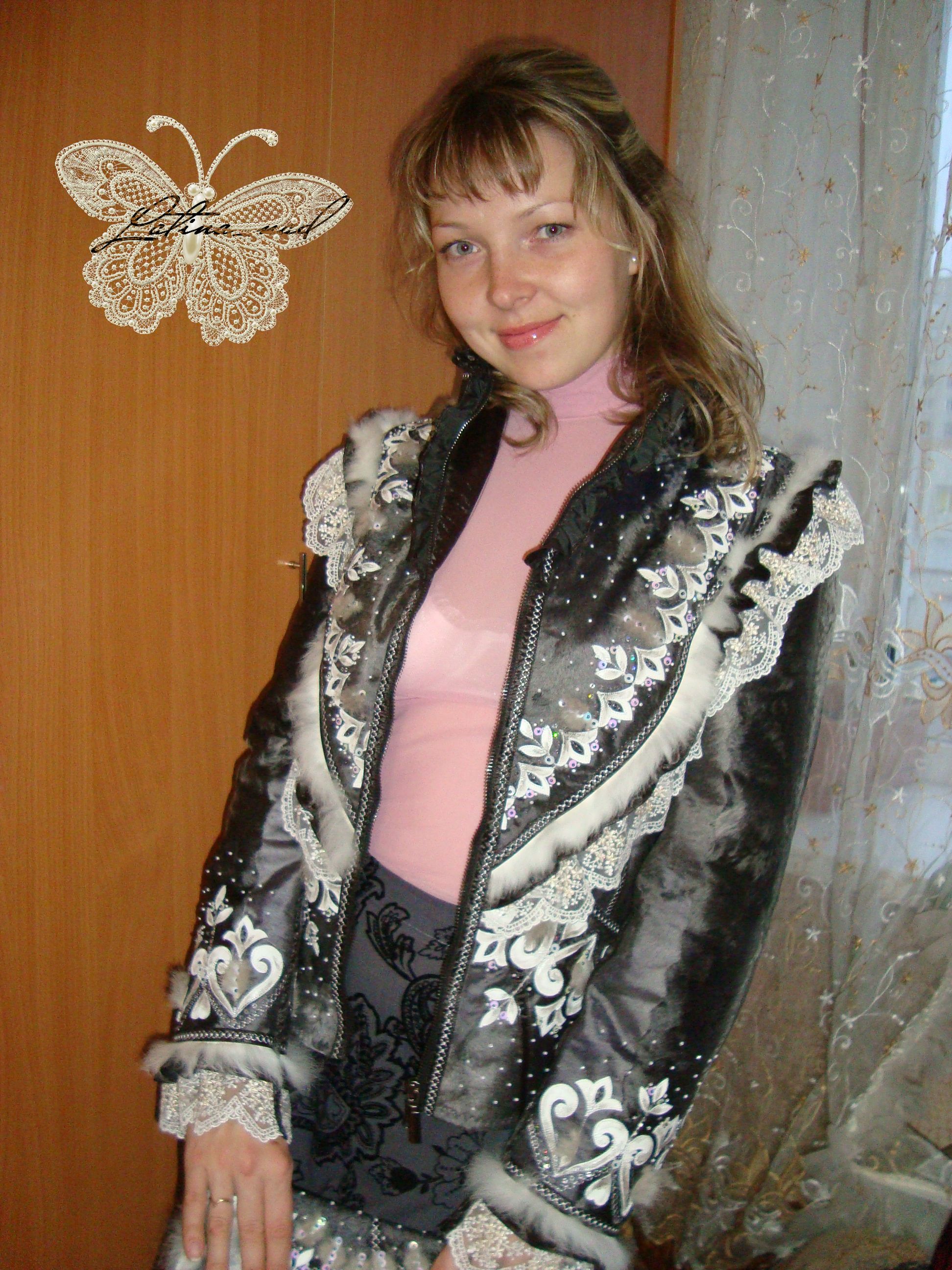 Авторская работа,Курточка и клатч из натурального меха, декор: аппликации из натур.кожи, шелковые кружева, бисер, декоративные строчки.
