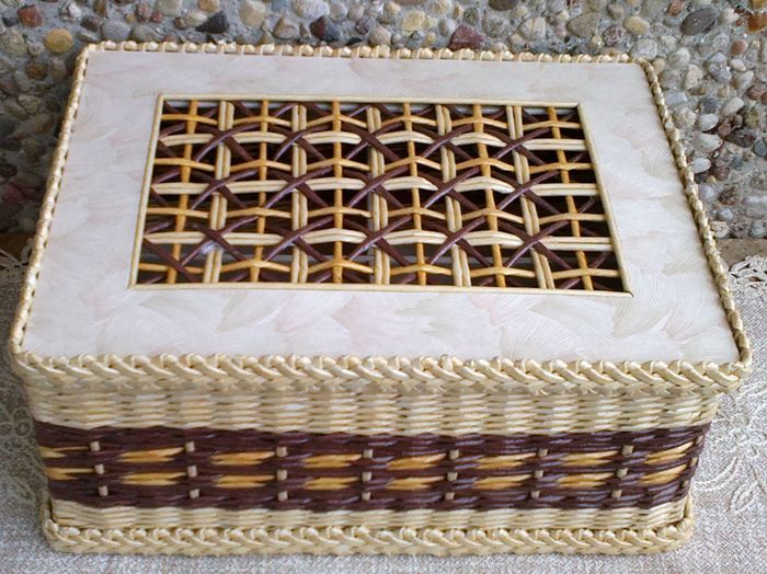Плетение из газет. Мастер-класс на крышку с цветным узором из трубочек.