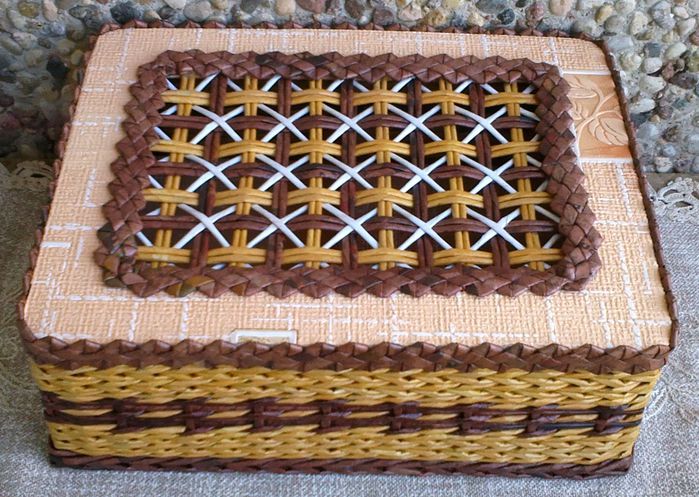 Плетение из газет. Мастер-класс на крышку с цветным узором из трубочек.