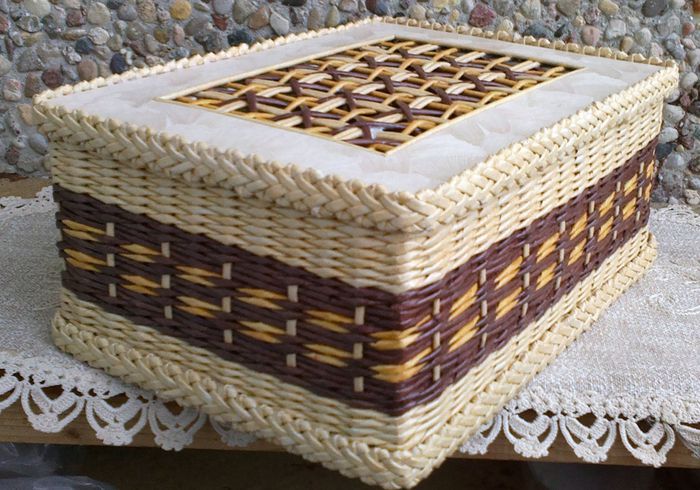 Плетение из газет. Мастер-класс на крышку с цветным узором из трубочек.
