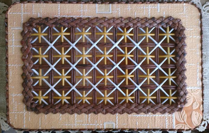 Плетение из газет. Мастер-класс на крышку с цветным узором из трубочек.