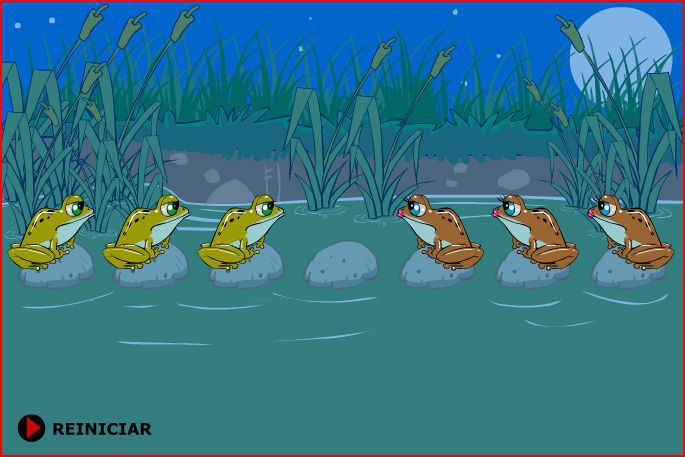 Логическая головоломка на смекалку: Расставь лягушек --- Задача: Поменять лягушек местами, коричневых - налево, зеленых - направо. Лягушки прыгают только вперед - на следующую кочку или через одну кочку в зависимости от наличия свободных