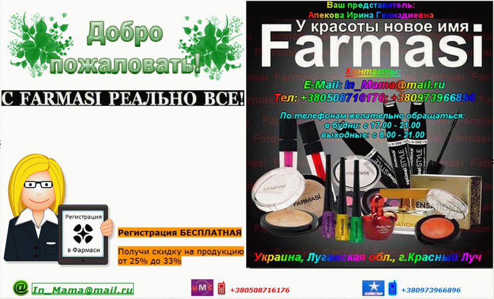 "Выбор! Выбор - это ключ ко всему. У вас есть возможности. Вы не обязаны проводить жизнь, погрязнув в неудачах, невежестве, горестях, бедности, стыде и жалости к себе. Можно жить лучше!" Элитная турецкая косметика Farmasi! Скидка 33 % !!!!!! СУПЕР ПРЕДЛОЖЕНИЕ !!!!! Беспрецедентное предложение для новичков Фармаси только с 15 октября по 15 ноября все новые консультанты Фармаси уже с заказом от 20 бб получат скидку 33% !!!!!!! Приглашаю стать консультантом компании Фармаси!