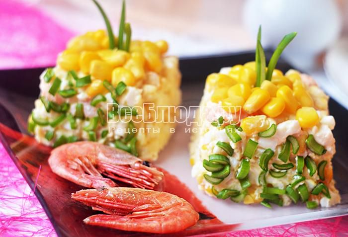 Порционный салат из креветок, сыра и кукурузы, рецепт с фото | Все Блюда