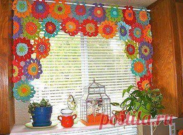 Весёлые летние шторы. Схемы нет - произвольное вязание. Воздушные петли, столбики с накидами, арочки - пускайте в ход Вашу фантазию и создавайте такие красивые цветочки! •••в продолжении ещё
