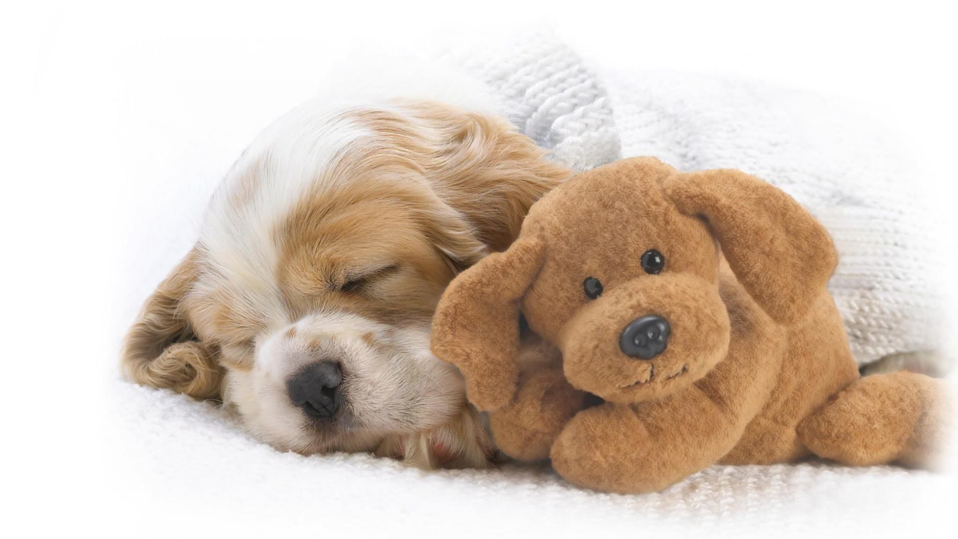 Спящий щеночек и мягкая игрушка обои 1920x1080.