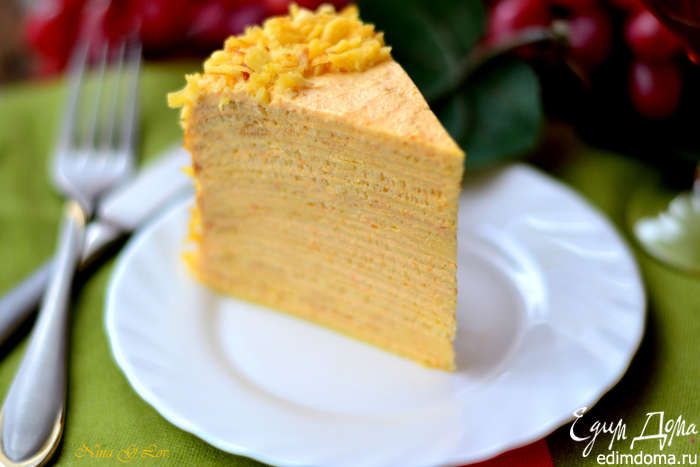 - На весь экран # шаг 17/19Украсить закусочный тортик, как мы бы украшали сладкий Наполеон,сразу же подавать и пробовать, так как если хранить такой тортик в холодильнике, блинчики теряют всю свою нежность,и если уж ставите в холодильник, то обязательно чем то этот тортик нужно накрывать!