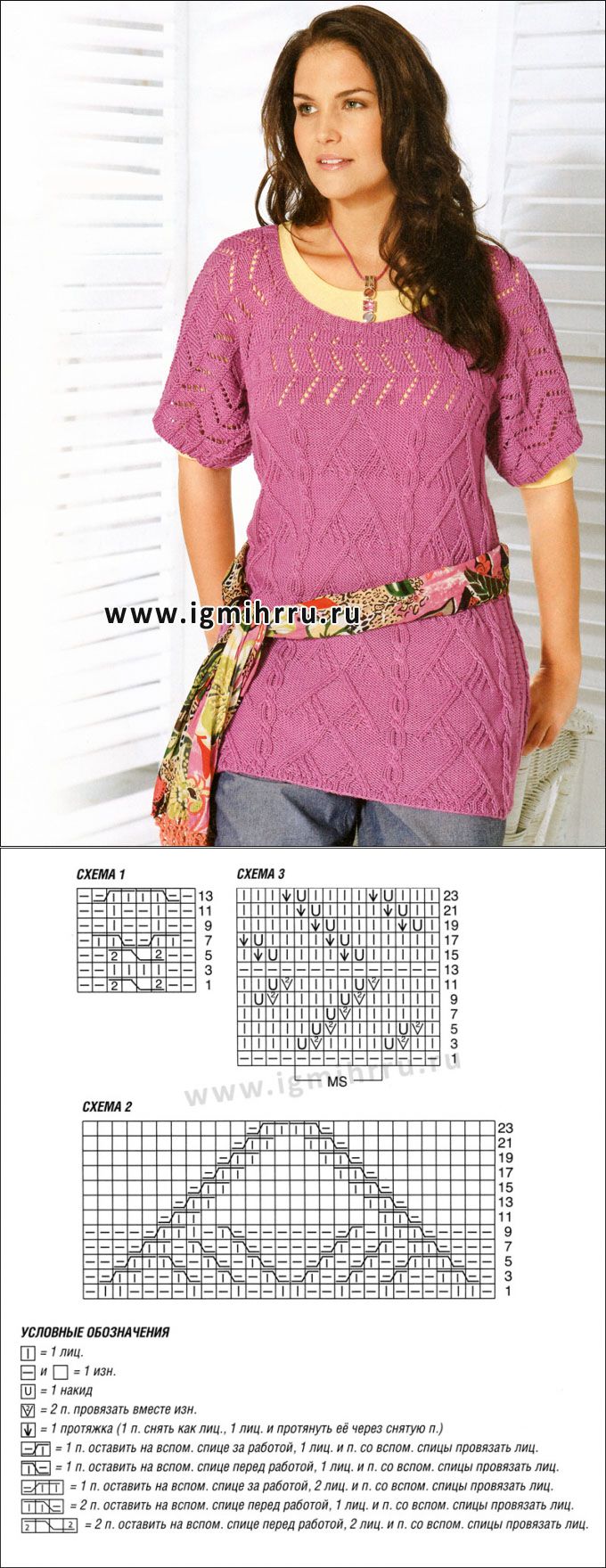 Микс красивых узоров. Длинный розовый пуловер для дамы приятной округлости. Спицы