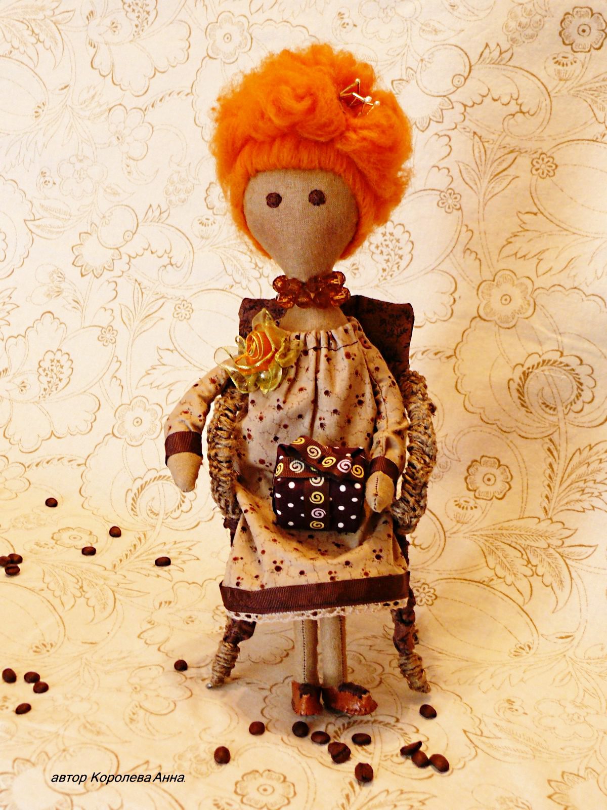 Вас приветствует - Принцесса Арабика Бурбон. Красивая и экстравагантная особа . Ей свойственны такие черты характера , как доброта и щедрость . Вот и в этот раз, удобно усевшись на своём любимом стуле, она вновь упаковывает подарки для своих друзей и просто знакомых - лучшие сорта кофейных зёрен. Эта композиция великолепно украсит ваш интерьер, создаст теплоту и уют в вашем доме .Лён-из которого сшита тело принцессы , пропитан на три раза вареным кофе, тем самым придаёт коже Принцессе цвет загар