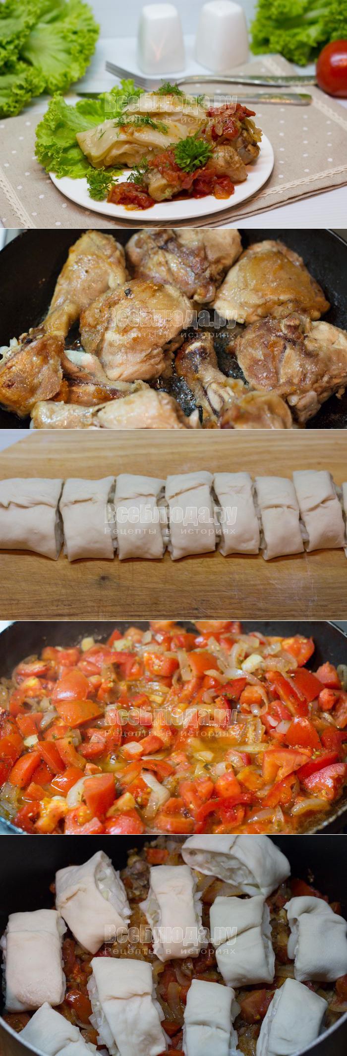 Курица с рулетиками из теста с луковой начинкой, тушеная в помидорах. Рецепт с пошаговыми фото | Все Блюда