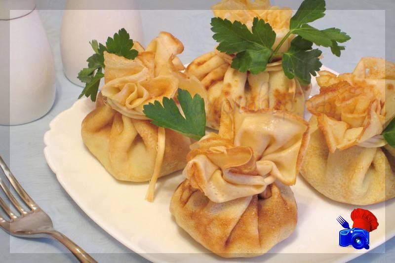 Мешочки с жульеном из блинчиков прекрасная подача и очень вкусное блюдо для праздничного и повседневного стола. Блинные мешочки могут служить как самостоятельное блюдо, так и быть дополнением, например к картофелю. Даже по отдельности они получаются очень сытными и питательными. Блюдо готовится достаточно просто и быстро. Пекутся тонкие блинчики, для того что бы они вышли действительно тонкими тесто нужно обогатить яйцом.