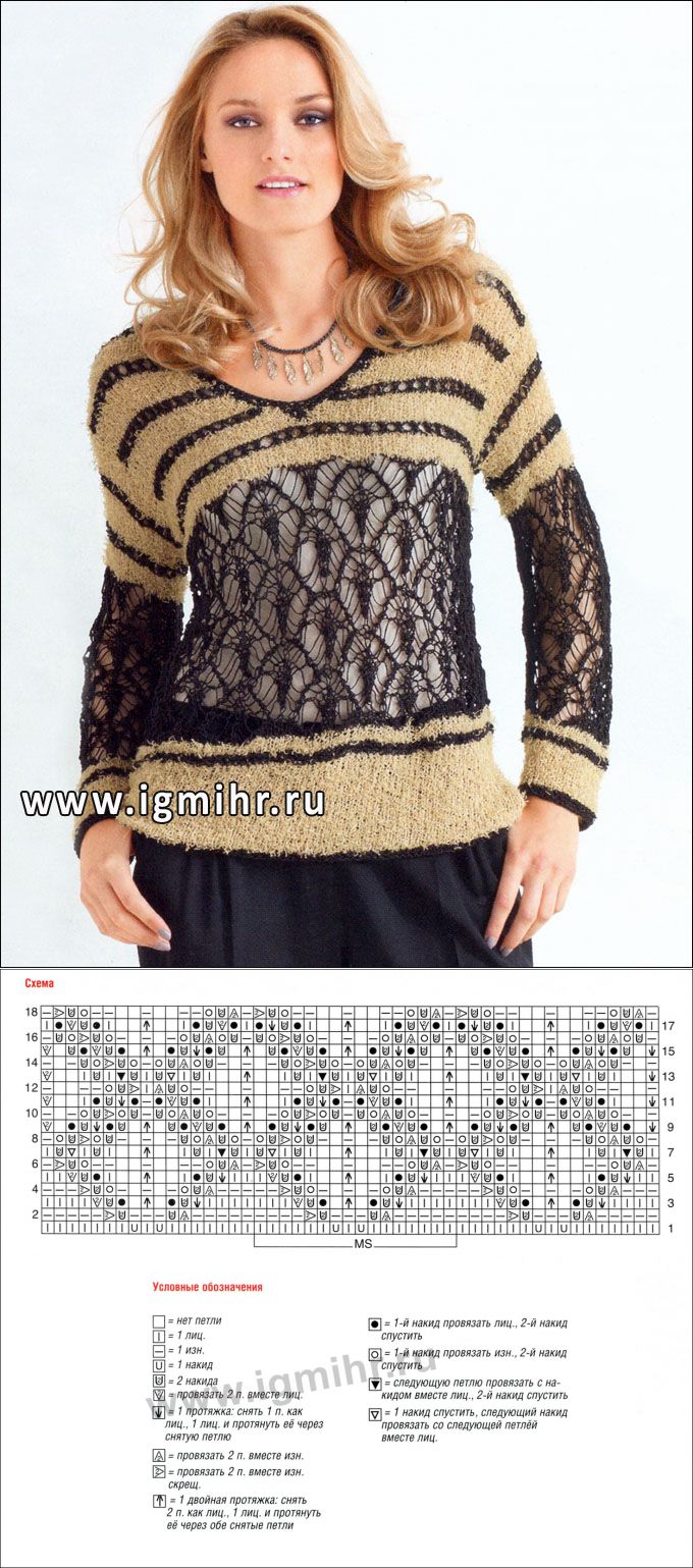 Пуловер с черным ажурным узором и полосами из дырочек. Спицы