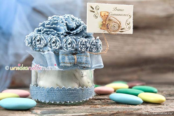 Декорирование предметов джинсовой тканью и полосками трикотажа.