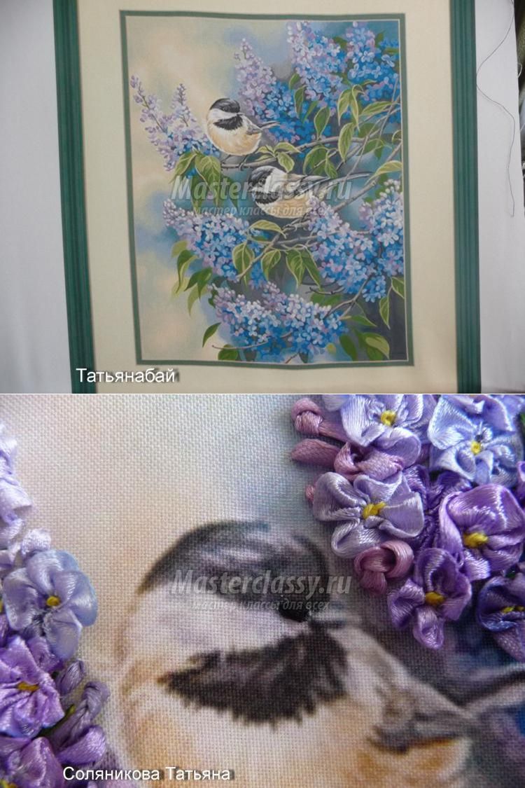 Вышивка лентами. Картина «Синицы на сирени». Часть 3. Мастер-класс с пошаговыми фото
