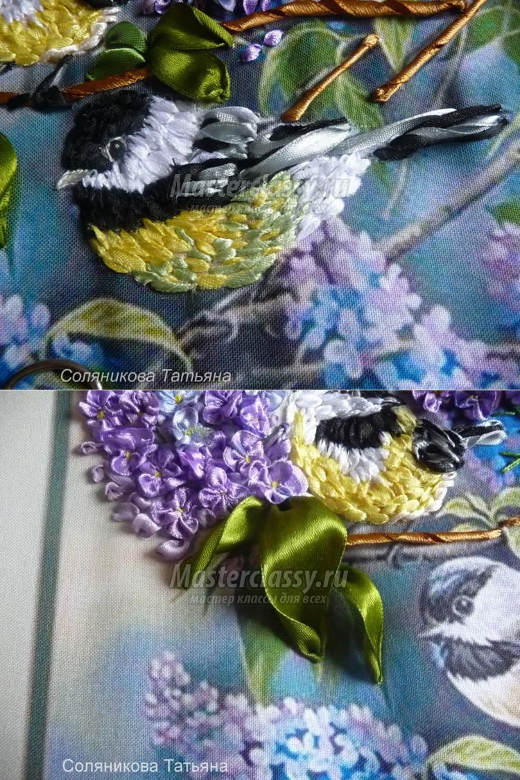 Вышивка лентами. Картина «Синицы на сирени». Часть 4. Мастер-класс с пошаговыми фото