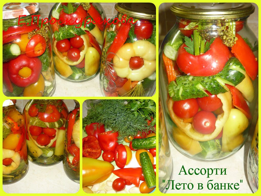 ЛЕТО В БАНКЕ - АССОРТИ !!! **Помидоры, огурцы, болг/перец, чеснок, чили, укроп, листья хрена, вишни и смородины (то, что есть!) -кладём в подготов/банки. *Вскипятим воду, залить овощи 15мин. Воду слить, и вскипятить Маринад: на 1л воды -по 2ст/л сахара и соли, 9%уксус 0.5ст. Залить им овощи, оставив на 20мин. Маринад слить в кастрюлю, прокипятить, и залить овощи. Закатать банки. *Хранится при комн/температуре !!!