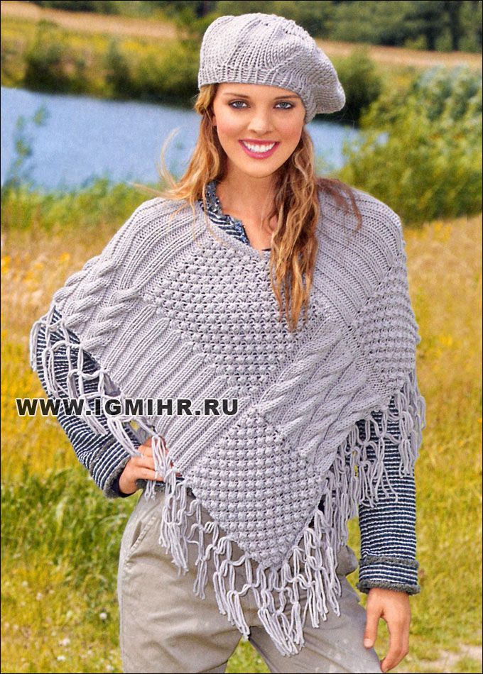 Светло-серое пончо и берет из мериносовой пряжи. Спицы