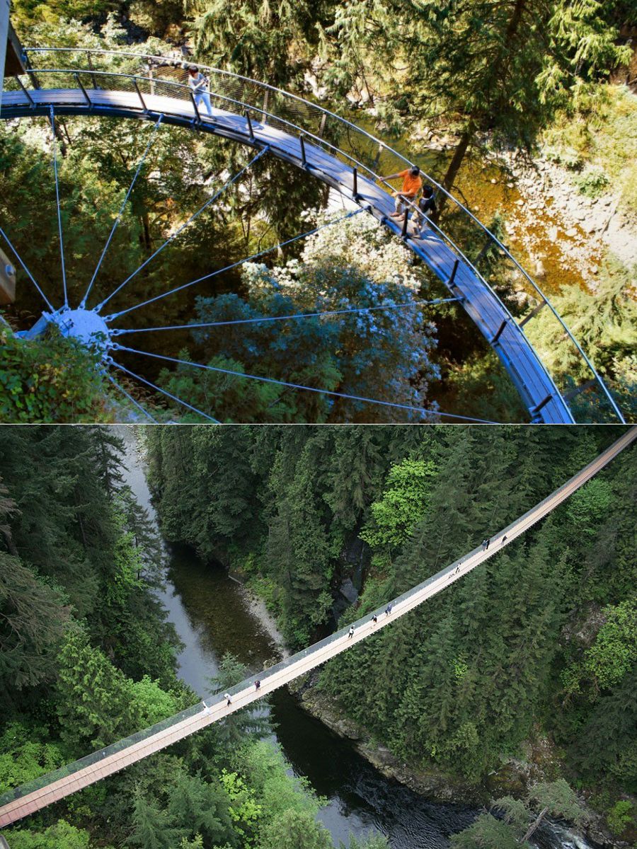 Мост на утесах, Ванкувер . Длиной 231 метр мост перекинут над рекой Капилано, а в своей самой высокой точке достигает высоты в 91 м над рекой.