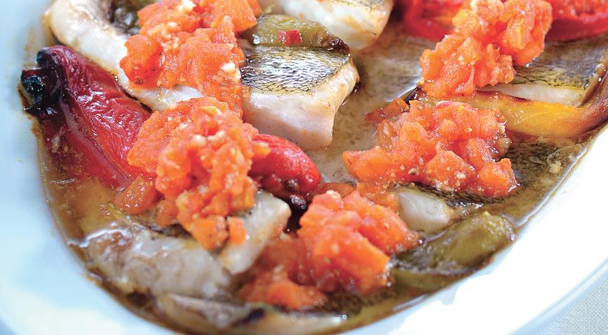 - Филе судака нарежьте порционными кусками, натрите солью и паприкой, поместите в форму для запекания, сверху выложите перцы, залейте помидорным пюре. Накройте фольгой и поставьте в духовку на 20 мин. Подавайте горячим, сбрызнув перед подачей оливковым маслом.