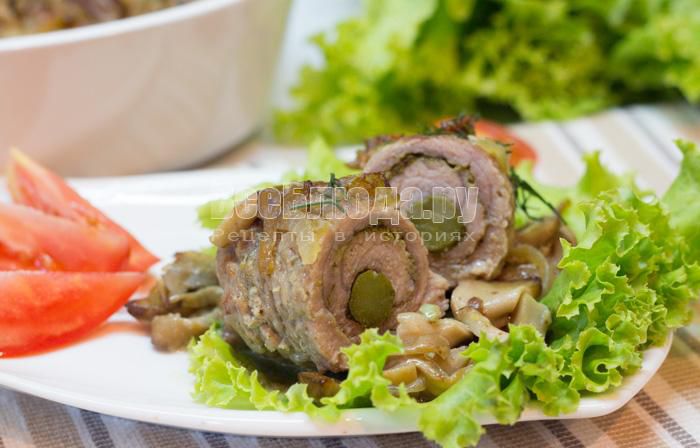 Как приготовить рулетики из мяса с огурцом, запеченные в духовке с грибами в сливках, рецепт с | Все Блюда