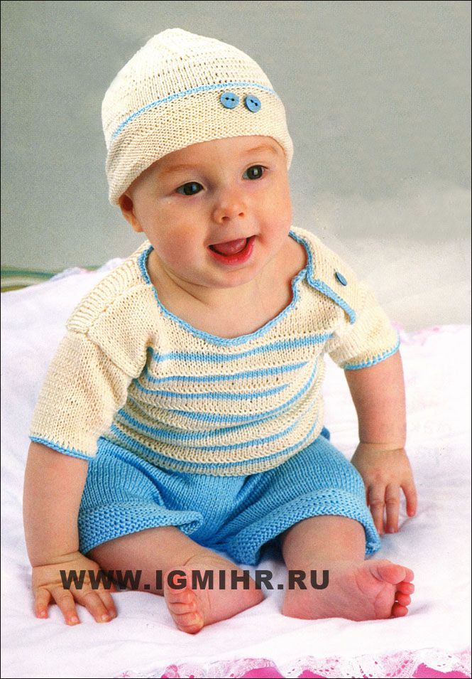 Летняя одежда для малышей. Комплект в нежных тонах для мальчика 6 месяцев. Спицы