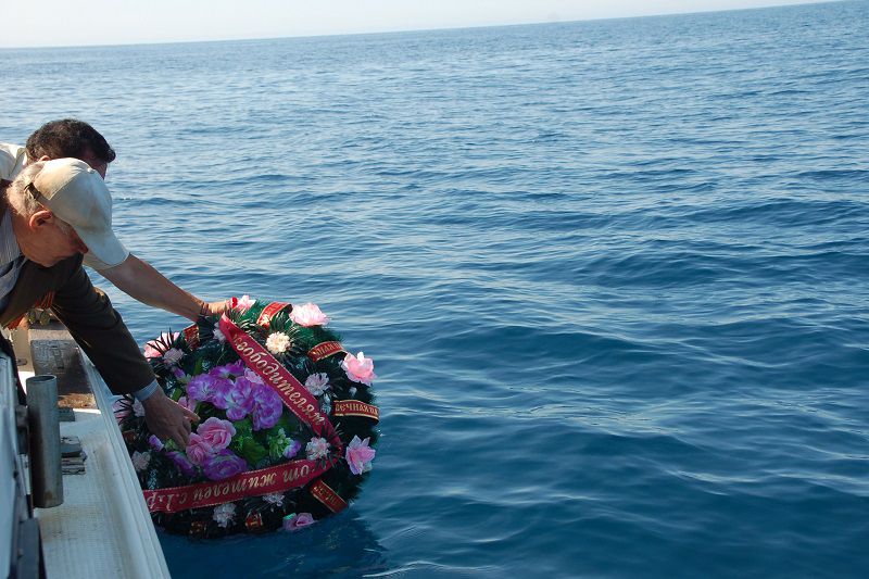 Жители холмского села Правда опустили в море венок, посвященный памяти павших воинов-освободителей Сахалина и Курильских островов. 03.09.2014. Холмск. Сахалин.Инфо