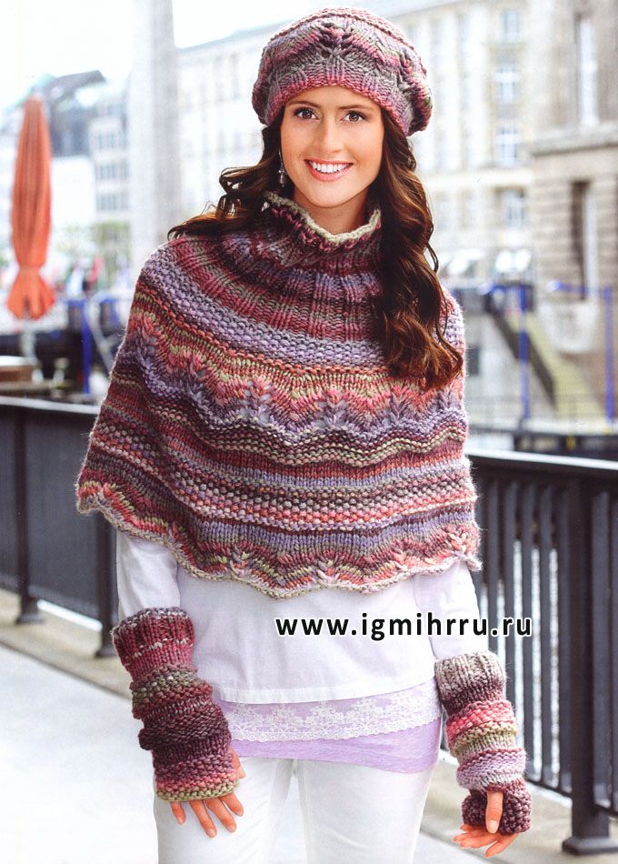 Романтичный стиль! Пончо, шапочка и нарукавники в сиренево-розовых тонах. Спицы / igmihrru.ru