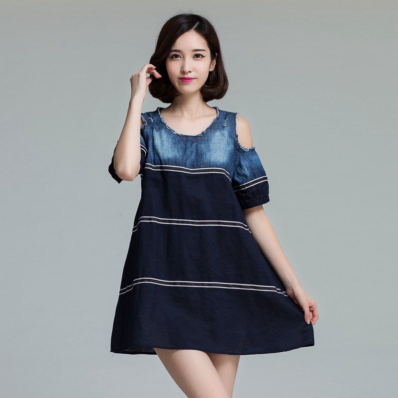 Синий Джинсы женские платья Свободные Хлопок Блузка на Uotimedress