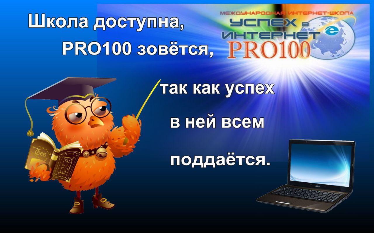 Для Вас у меня особенный подарок : предлагаю всем повысить свою компьютерную грамотность и пройти Курсы (3-х недельные ) при Международной Интернет -школе "Успех в Internet PRO100" ! Регистрируйтесь по ссылке http://www.pro100school.com/account/register?r=32435
