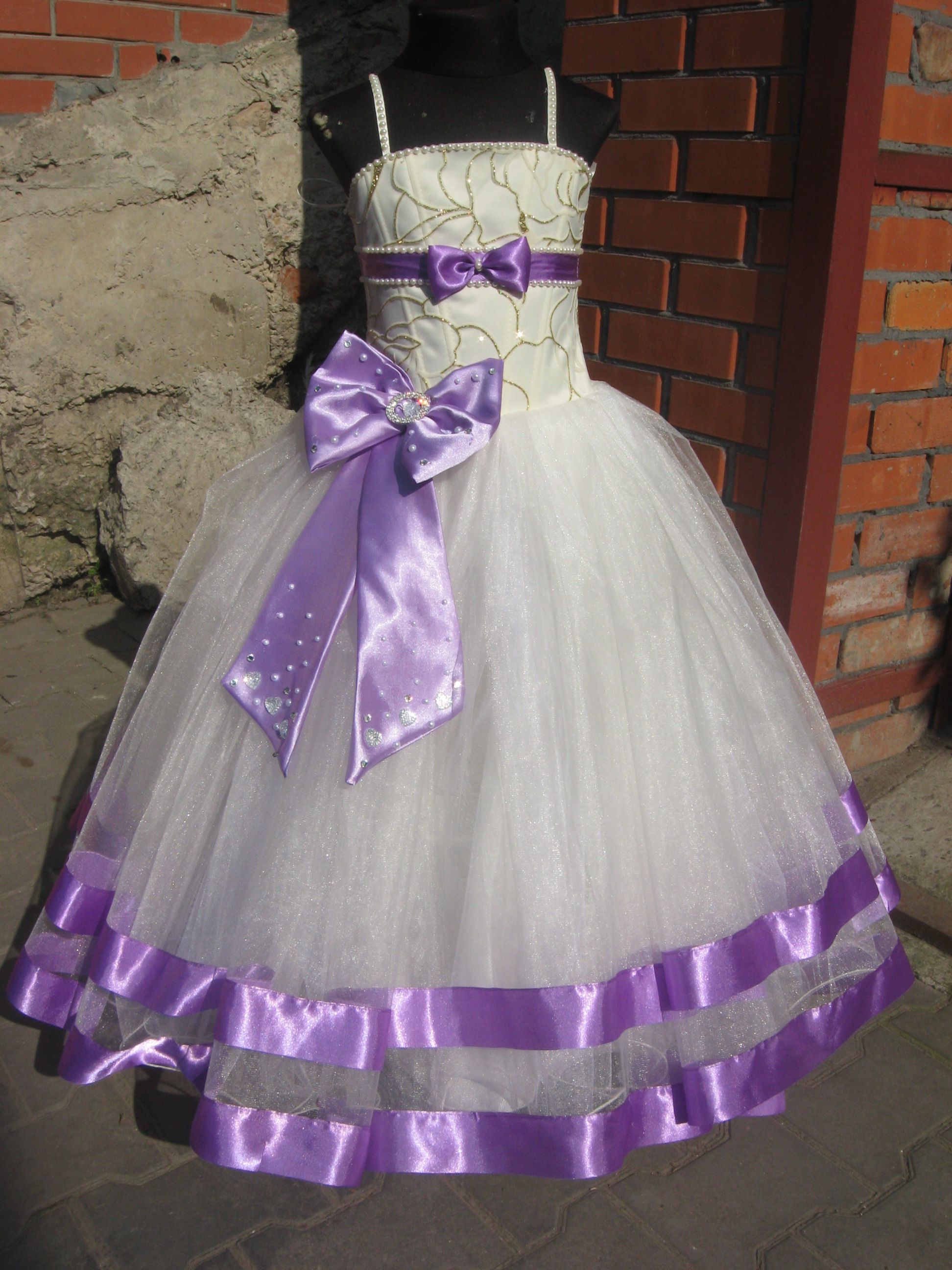кремовое платье с отделкой сереневой атласной лентой