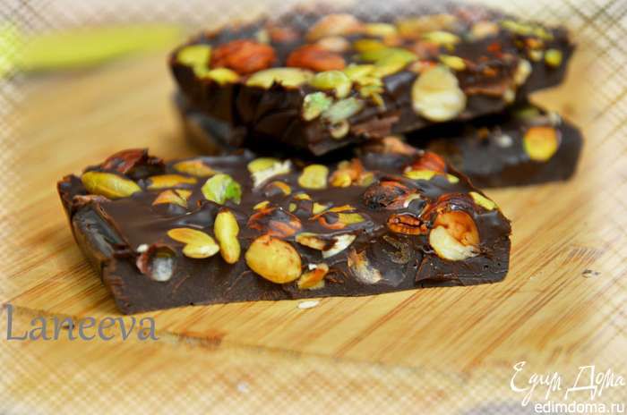 - На весь экран # шаг 6/7Вылить шоколад растопленный в форму, присыпать орехами и семечками тыквы. Поставить застывать в холодильник.