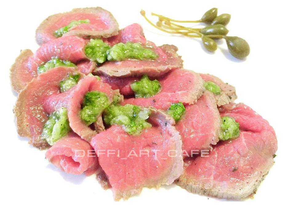 МЯТНЫЙ РОСТБИФ-КАРПАЧЧО Я просто обожаю карпаччо! Хорошее выдержанное с рассыпающейся на кристаллы стружкой пармезана! Но мне захотелось поиграть вокруг этой темы, чтоб угодить не только себе, но и семье, и друзьям. Вот и придумалось такое блюдо, как ростбиф-карпаччо. ..