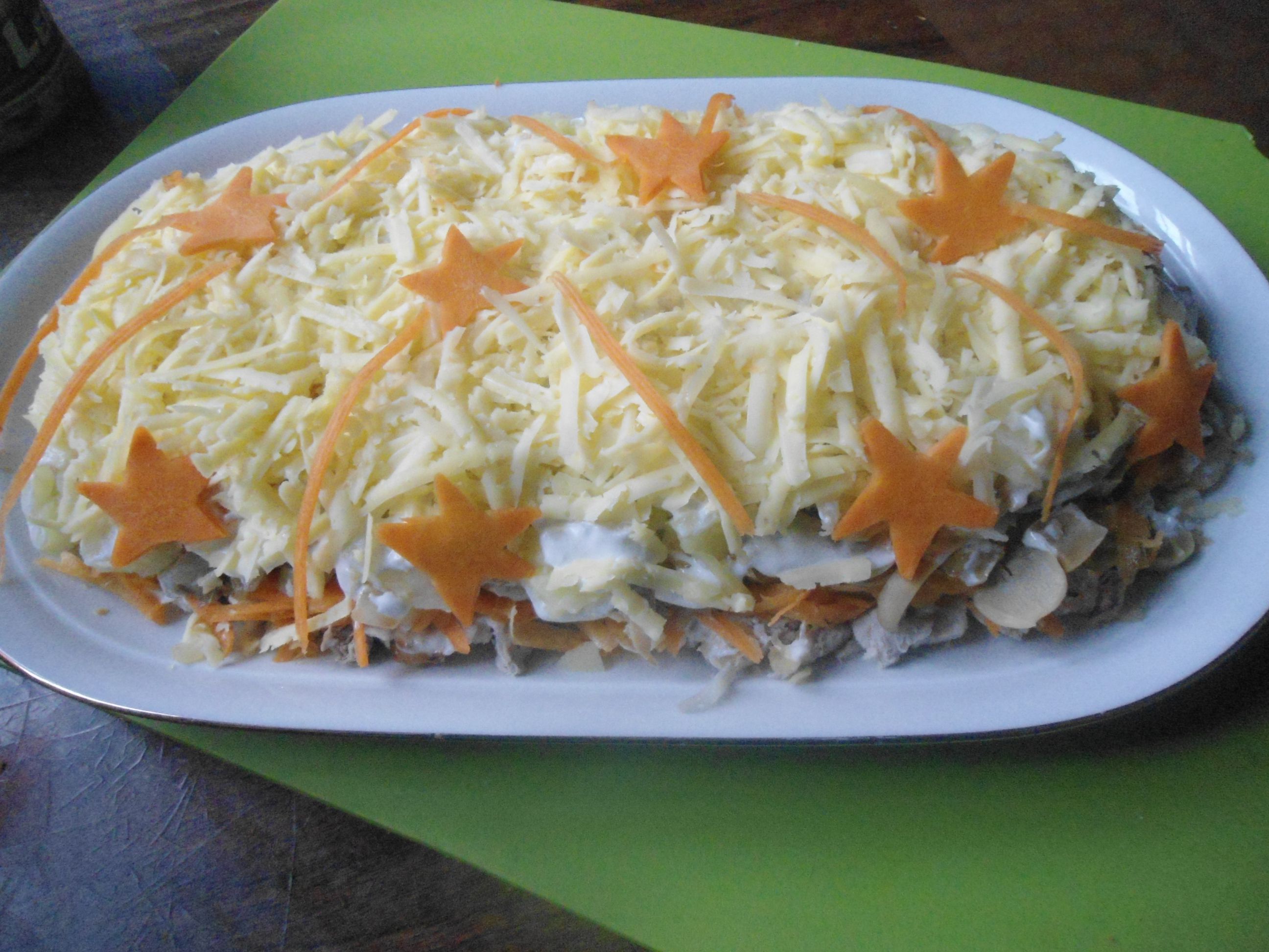 Салат слоеный "Поляна звезд" с курицей и овощами рецепт пошаговый http://ligakulinarov.ru/r/salat_sloenyy_polyana_zvezd_s_kuritsey_i_ovoshchami_1296