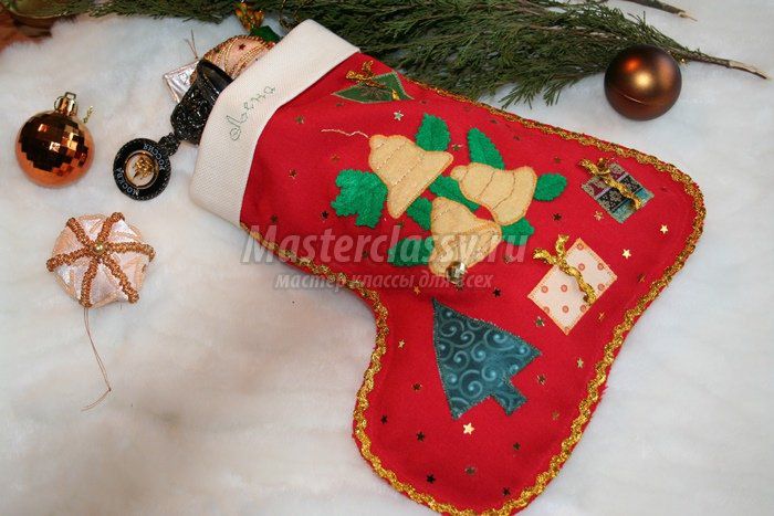 Новогодний сапожок для подарков. Аппликация «Колокольчики». Мастер класс.