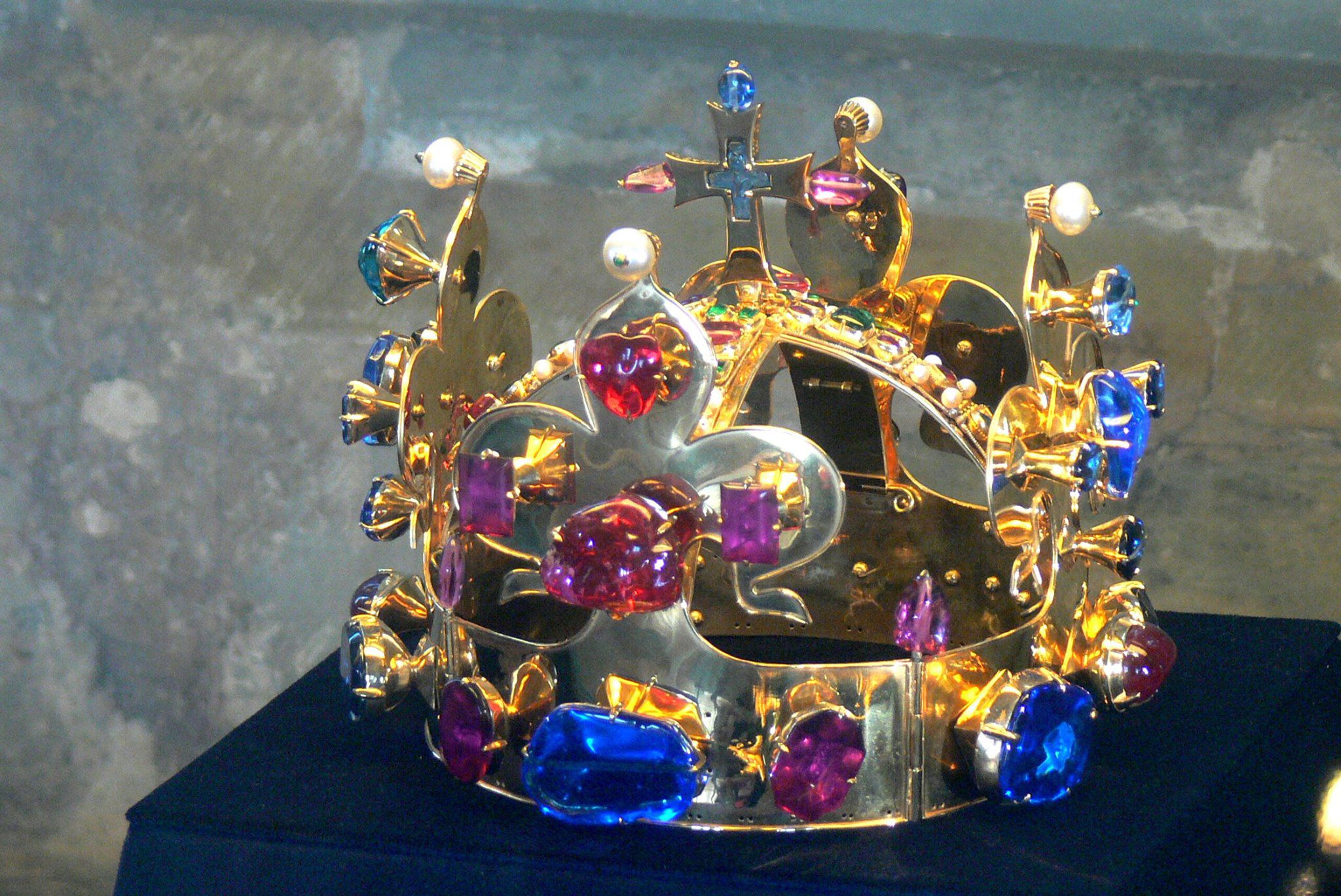 Корона святого Вацлава 1347 год.Корона из золота,украшена 19 крупными сапфирами, 44 шпинелями, огромным кроваво-красным рубином, 30 изумрудами и 20 жемчугами.
