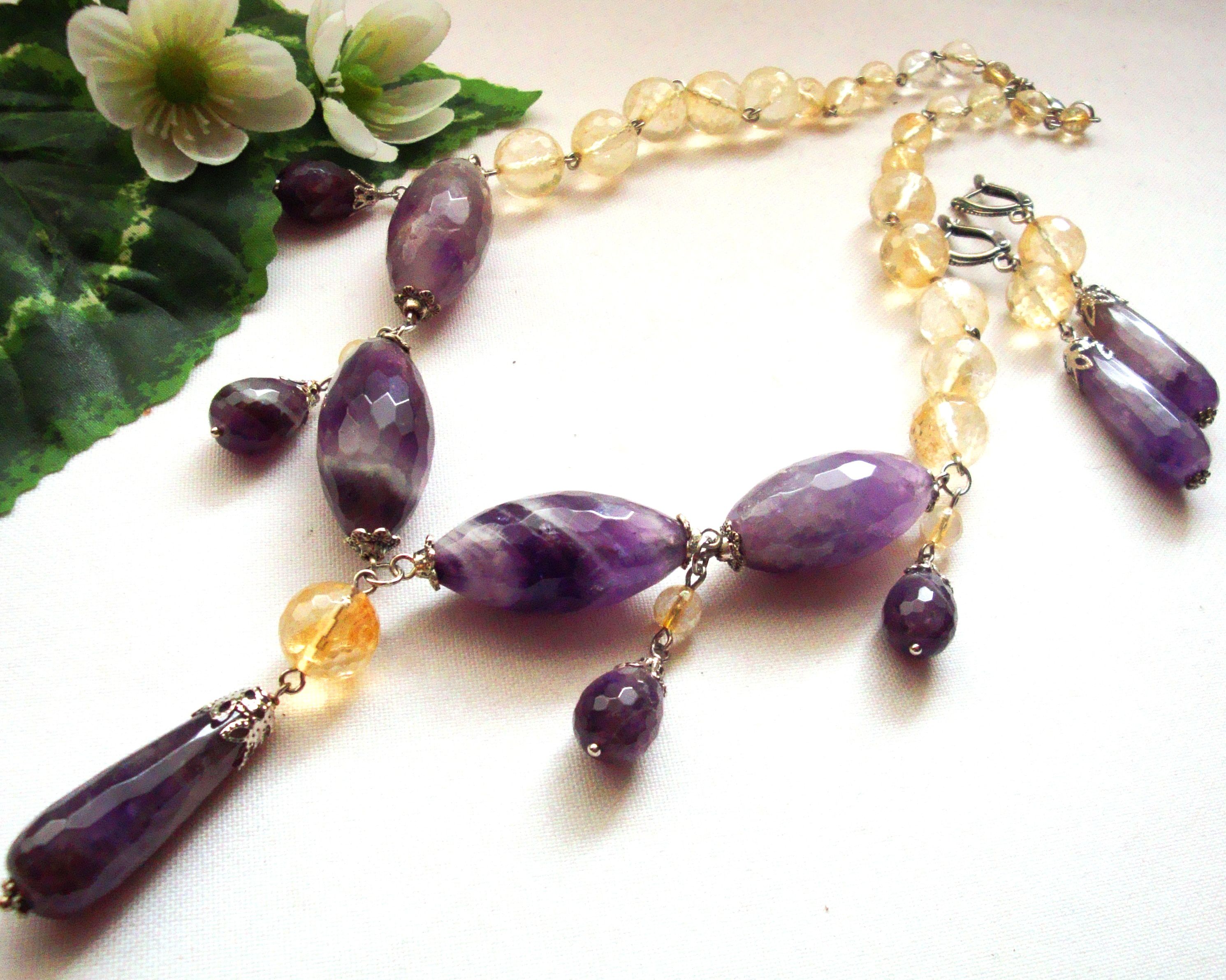 Колье "Миранда" из аметиста и цитрина с подвесками. Длина колье 50 см, длина центральной подвески 4 см.