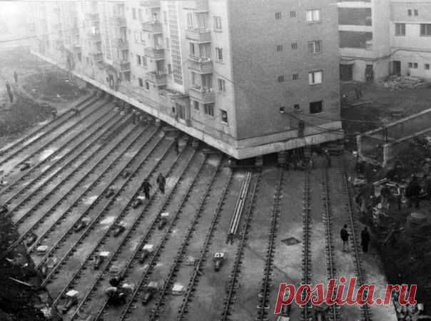 Перемещение 7600-тонного многоквартирного жилого здания, которое провели, чтобы проложить бульвар в румынском городе Алба-Юлия, 1987 год.