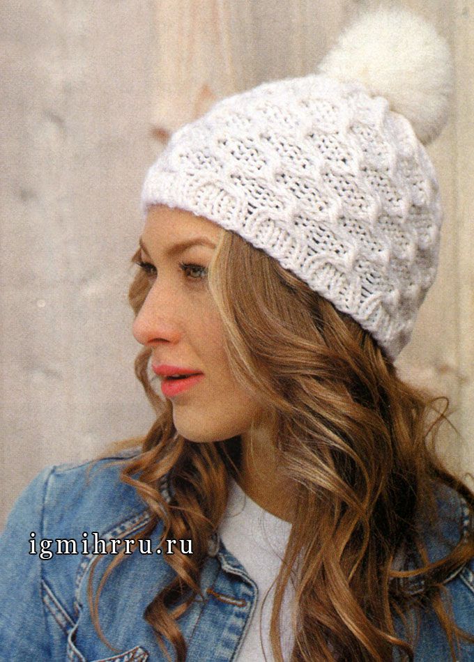 Белая шапка с рельефным узором и помпоном, от финских дизайнеров. Спицы