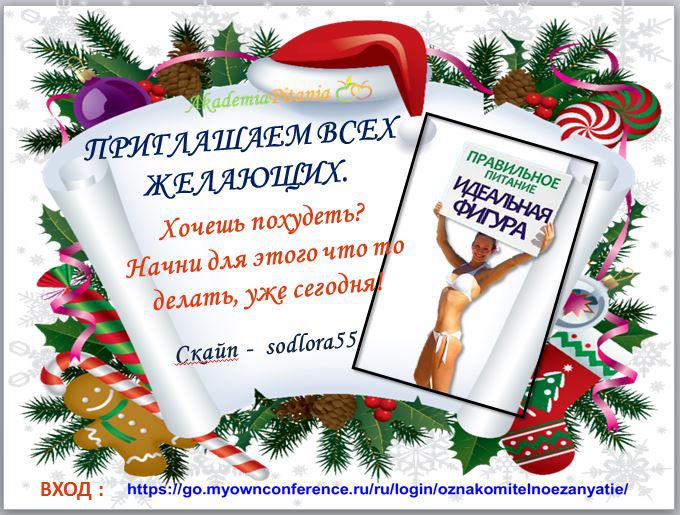 Меняй образ жизни!!!Встреть НОВЫЙ 2015 ГОД – ОБНОВЛЁННОЙ И СЧАСТЛИВОЙ!!! Приходи! ПОМОЖЕМ! Ежедневно: Понедельник – 19-00 Вторник - 15-00 и 19-00 Среда – 21-00 Четверг – 15-00 и 21-00 Пятница – 21-00 Воскресенье – 10-00 Время московское.