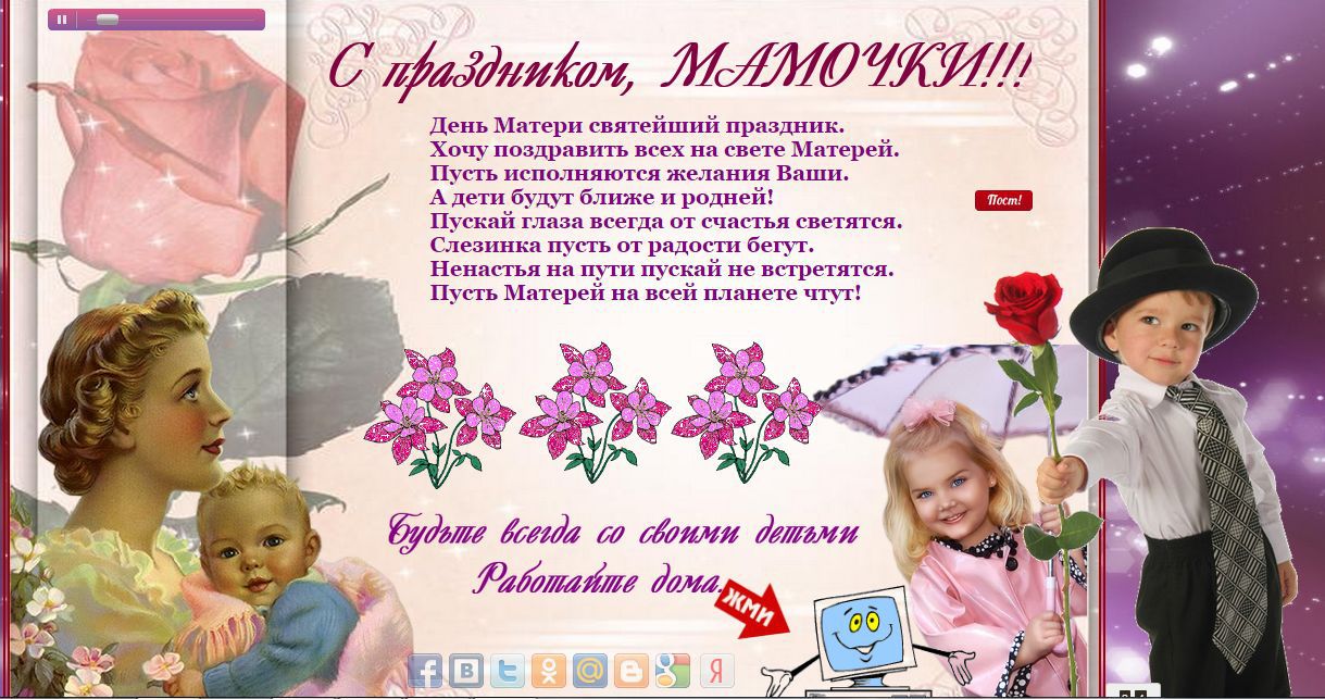 Добрейший, светлый и красивый праздник День Матери в финале ноября, Возможность замечательную дарит Поздравить, мама милая, тебя! Всенепременной пожелать удачи Здоровья, сил и радостнейших дней! Пусть твое сердце никогда не плачет, Будь счастлива сама и за детей!