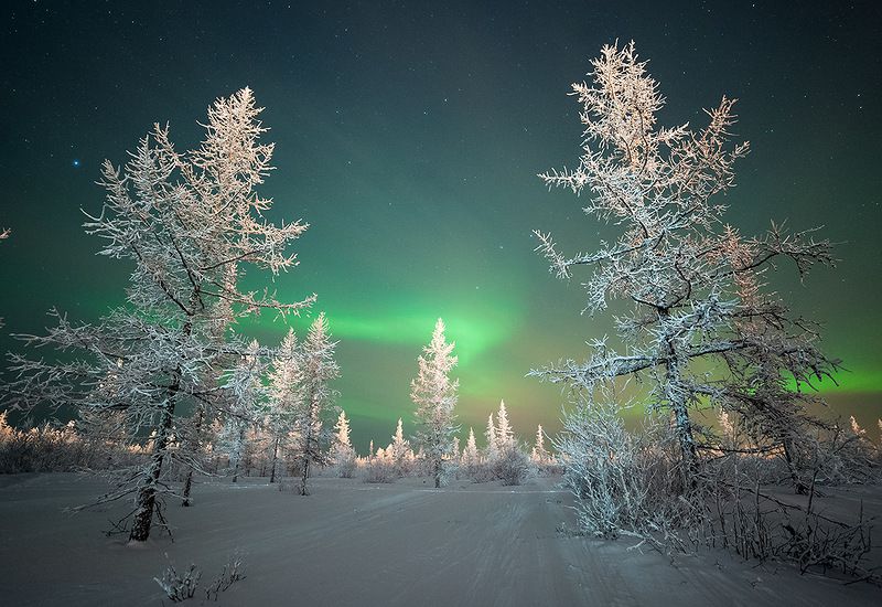 Зимняя сказка. Метки:лес, ночь, полярное сияние  Фото: Андрей Снегирёв / Яндекс.Фотки