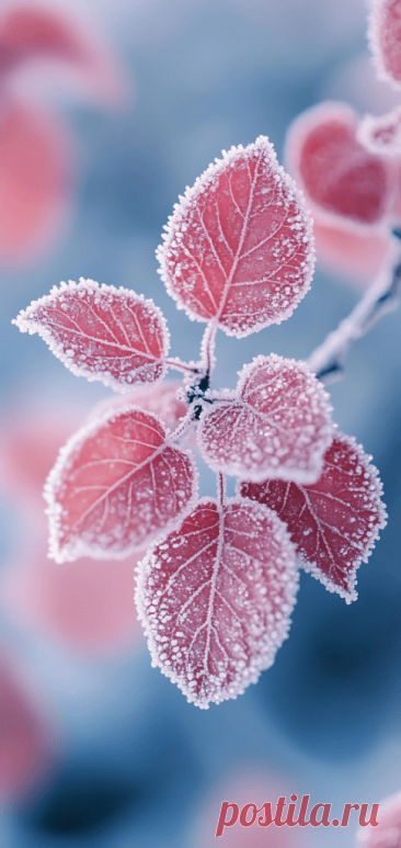 the leaves are covered in frost on the tree branch with yellow and red berries behind them