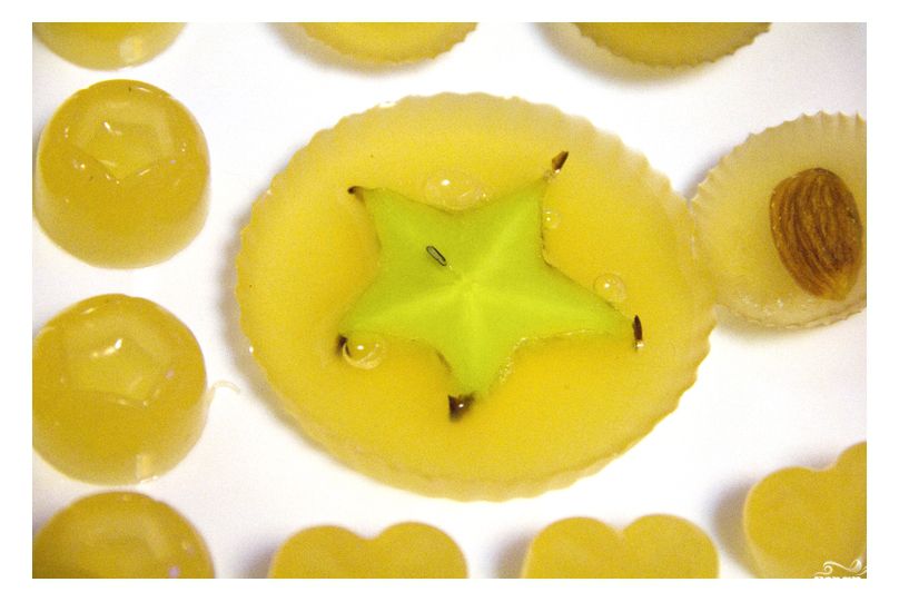 - 1. Желатин разводим водой и оставим разбухать. Тем временем подготовьте остальные ингредиенты, очистите карамболу и т.д. 2. Затем ставим на маленький огонь миску с желатином, постоянно помешиваем, - не должно остаться комков. Затем добавим сюда же мед и лимонный сок. Тщательно перемешаем. 3. Теперь подготовим формочки. Отлично подойдут оставшиеся упаковки от конфет, или же формы для маффинов. Выкладываем кусочки фруктов или орешков на дно формы, и заливаем полученной смесью. 4. Оставим в холодильнике до полного застывания. Готово!