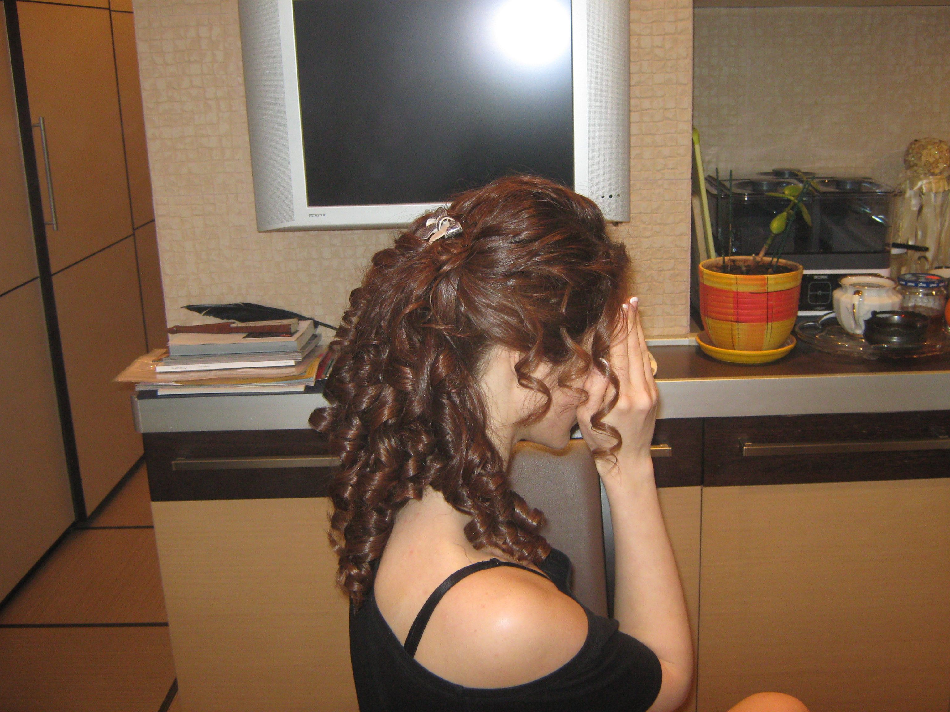 Вечерняя прическа на выпускной балл или свадьбу.Оформляется с помощью термобигуди и конусной плойки. Для более стойкого и длительного сохранения прически применялась пенка сильной фиксации и лак ультрасильной фиксации для волос от шварцкоп..