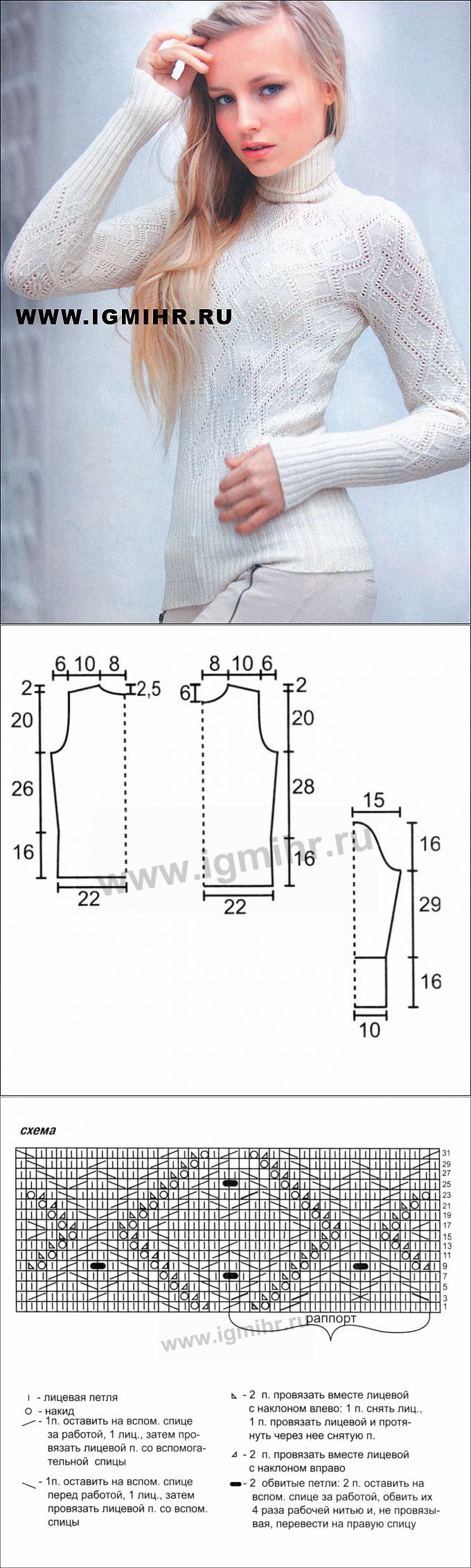 Белая водолазка с ромбами, из мериносовой шерсти. Спицы