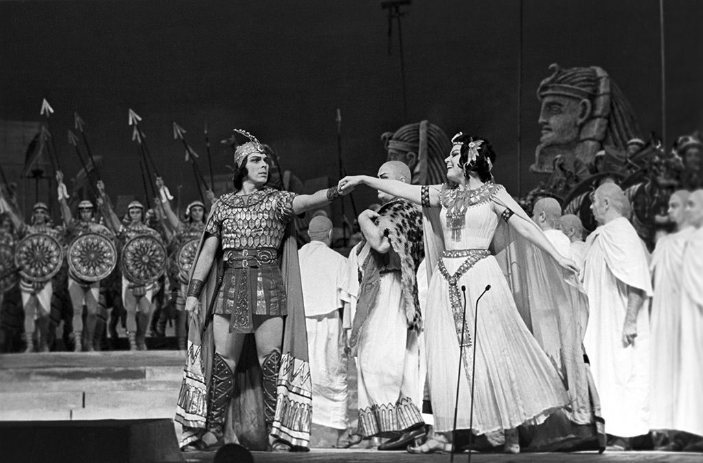Сцена из оперы Джузеппе Верди «Аида». Партию Амнерис исполняет народная артистка РСФСР Елена Образцова, в роли Радамеса — заслуженный артист РСФСР Владислав Пьявко, 1976 год.